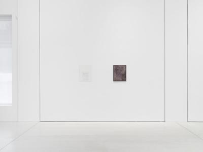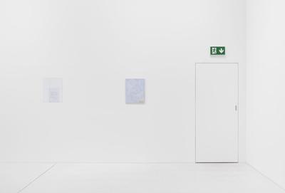 The text-works are working sheets on which Nistor formulates propositions that describe and question the concepts related to this process. A typed version of several sentences written underneath each other is commented on and corrected by hand, which gives insight into her process of thinking and doubt. Furthermore, it suggests a sedimentation through revision and redefinition, paralleled in the paintings. Both painting and writing are presented as processes that formulate and challenge how we think and perceive.